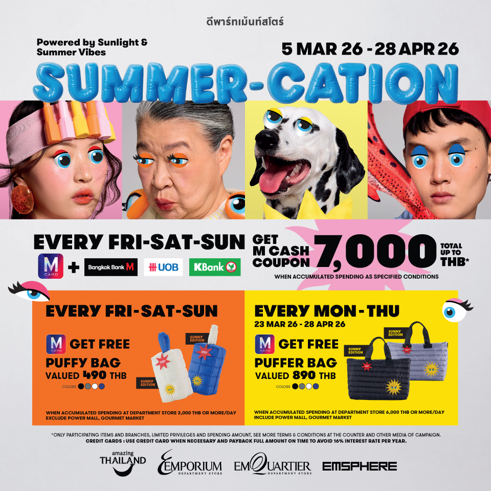 M Cardmembers will receive a Puffy Bag worth 490 baht and M Cash Coupons worth up to 1,800 baht when spending within the Department Store (excluding Power Mall and Gourmet Market), or spending within Emporium Shopping Complex (Sports Mall Inter Brands only), reaches the specified amount per day.