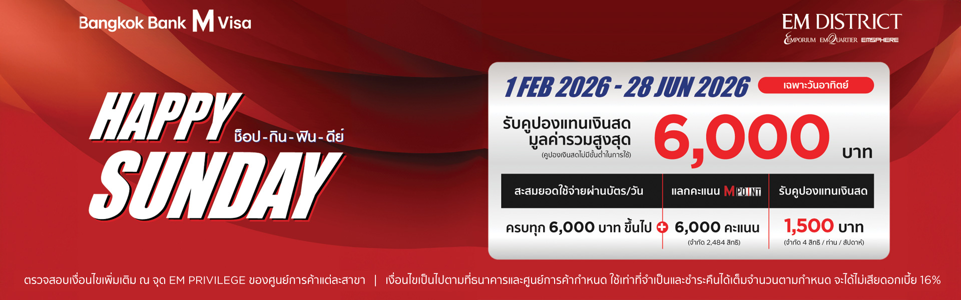 พิเศษ! ลูกค้า Bangkok Bank M Visa HAPPY SUNDAY ช็อป กิน ฟิน ดีย์ 1 Feb 26 – 28 Jun 26