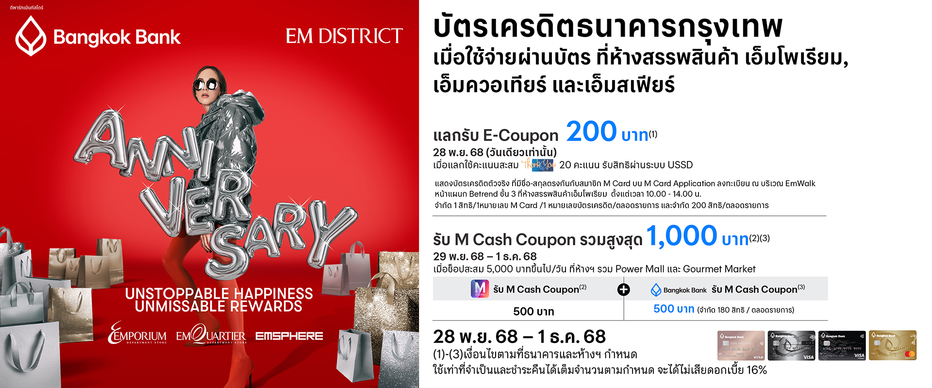 - สงวนสิทธิการใช้ M Cash Coupon สำหรับซื้อสินค้าในครั้งถัดไปคู่กับบัตรเครดิตธนาคารกรุงเทพ สำหรับการซื้อสินค้าในครั้งถัดไป ที่ห้างฯ เอ็มโพเรียม, เอ็มควอเทียร์, เอ็มสเฟียร์ รวม Power Mall, Gourmet Market เท่านั้น