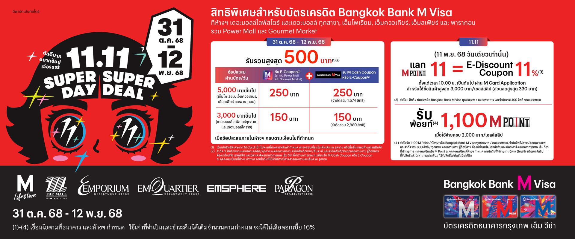 1. ผู้ถือบัตรเครดิต Bangkok Bank M Visa กดรับสิทธิ์แลก 11 M Point รับ E-Discount Coupon 11% ผ่าน M Card Application สำหรับใช้ซื้อสินค้าสูงสุด 3,000 บาท/เซลส์สลิป (ส่วนลดสูงสุด 330 บาท) ตั้งแต่เวลา 00 น. เป็นต้นไป เฉพาะวันที่ 11 พ.ย. 68