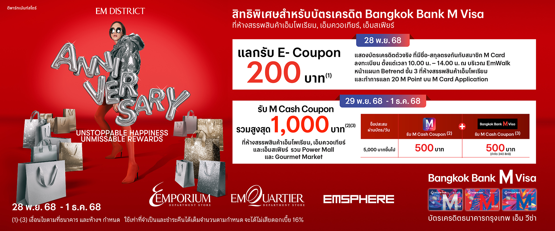 • M Cash Coupon หมดเขตการใช้ในวันที่ 28 กุมภาพันธ์ 2569 และสงวนสิทธิ์การใช้ M Cash Coupon คู่กับบัตรเครดิต Bangkok Bank M Visa สำหรับการซื้อสินค้าในครั้งถัดไป ที่ห้างฯ เอ็มโพเรียม, เอ็มควอเทียร์, เอ็มสเฟียร์ รวม Power Mall, Gourmet Market เท่านั้น