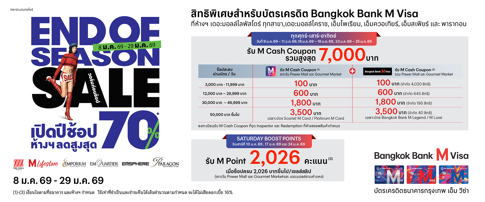 •    สิทธิพิเศษสำหรับบัตรเครดิต Bangkok Bank M Visa ที่มียอดใช้จ่ายผ่านบัตร เฉพาะชำระเต็มจำนวน (ไม่รวมรายการแบ่งชำระ) ที่ห้างสรรพสินค้าเดอะมอลล์ไลฟ์สโตร์ ทุกสาขา,เดอะมอลล์โคราช, เอ็มโพเรียม, เอ็มควอเทียร์, เอ็มสเฟียร์ และพารากอน (ยกเว้น พาวเวอร์ มอลล์, กรูเมต์ มาร์เก็ต ไม่เข้าร่วมรายการส่งเสริมการขาย)