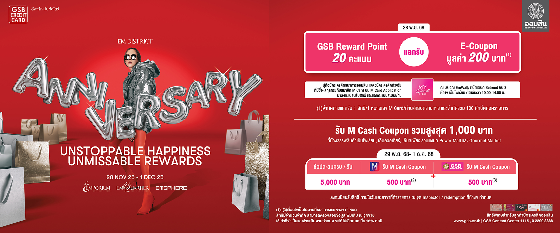 - ผู้ถือบัตรเครดิตธนาคารออมสิน ลงทะเบียนรับสิทธิ์ และแลกคะแนนสะสม 20 คะแนน ผ่าน My Card By GSB Application ณ บริเวณ Emwalk หน้าแผนก Betrend ชั้น 3 ที่ห้างฯเอ็มโพเรียม ตั้งแต่เวลา 00-14.00 น.