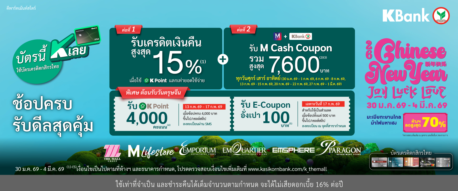 • E-Coupon สำหรับใช้ซื้อสินค้าตั้งแต่ 500 บาทขึ้นไป/เซลส์สลิป ภายในห้างสรรพสินค้า เดอะมอลล์ ไลฟ์สโตร์ และเดอะมอลล์ทุกสาขา เอ็มโพเรียม เอ็มควอเทียร์ เอ็มสเฟียร์ และพารากอน รวม Power Mall และ Gourmet Marke, E-Coupon หมดเขตการใช้งานวันที่ 28 ก.พ. 69 และสงวนสิทธิ์การใช้คู่กับบัตรเครดิตกสิกรไทยเท่านั้น