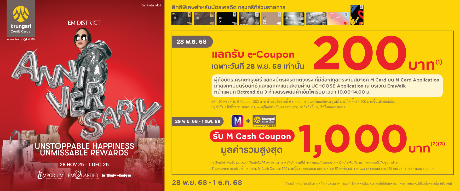 - บัตรเครดิต กรุงศรี: จำกัดการรับ M Cash Coupon 500 บาท /ผู้ถือบัตร/ตลอดรายการ, จำกัด 50 สิทธิ์/ทุกสาขา/วัน,จำกัดสิทธิ์รวม 150 สิทธิ์ / ทุกสาขา / ตลอดรายการ สาขาเอ็มโพเรียม, เอ็มควอเทียร์ และเอ็มสเฟียร์ สามารถรวมใบเสร็จกันได้