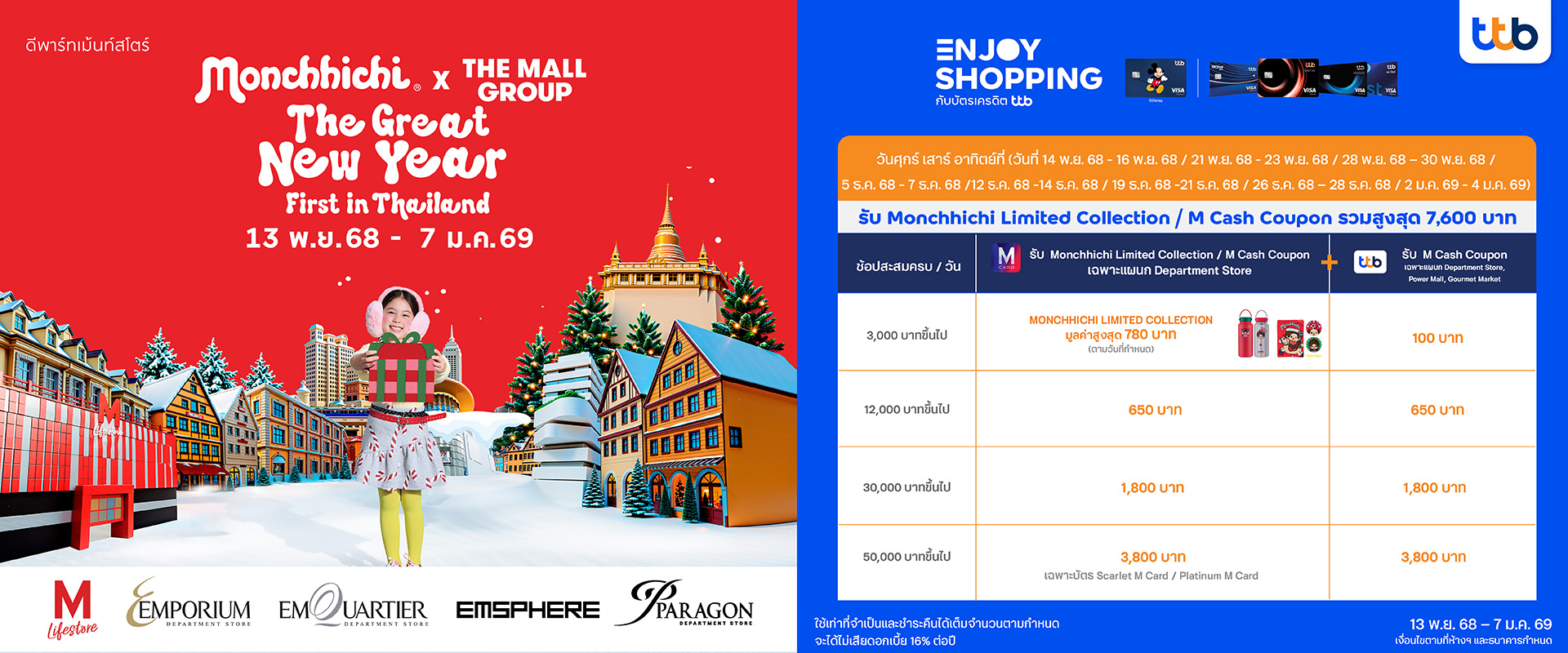 จำกัดรับ M Cash Coupon สูงสุด 3,800 บาท/บัตร/ทุกสาขา/ตลอดรายการ, จำกัดรวม 1,550 สิทธิ์/ทุกสาขา/ตลอดรายการ, นำใบเสร็จ เซลล์สลิป และบัตรเครดิตมาลงทะเบียนรับ M Cash Coupon ภายในวันและสาขาที่ทำรายการ ณ จุดแลกรับของสมนาคุณที่ห้างฯกำหนด, สาขาเอ็มโพเรียม เอ็มควอเทียร์ และเอ็มสเฟียร์ สามารถรวมใบเสร็จกันได้, ใบเสร็จหรือเซลส์สลิปบัตรเครดิตที่ใช้ลงทะเบียนรับสิทธิ์ไปแล้วไม่สามารถนำไปใช้รับสิทธิ์ร่วมกับรายการส่งเสริมการขายอื่นของบัตรเครดิต ttb ได้อีก, M Cash Coupon หมดอายุการใช้งานในวันที่ 31 มี.ค. 69, สงวนสิทธิ์การใช้ M Cash Coupon สำหรับซื้อสินค้าในครั้งถัดไปคู่กับบัตรเครดิต ttb เท่านั้น