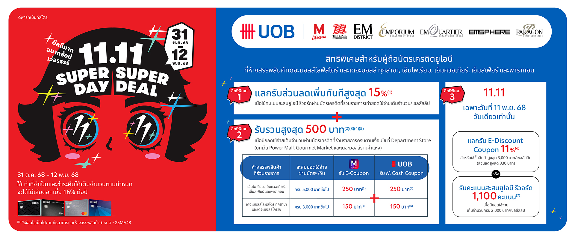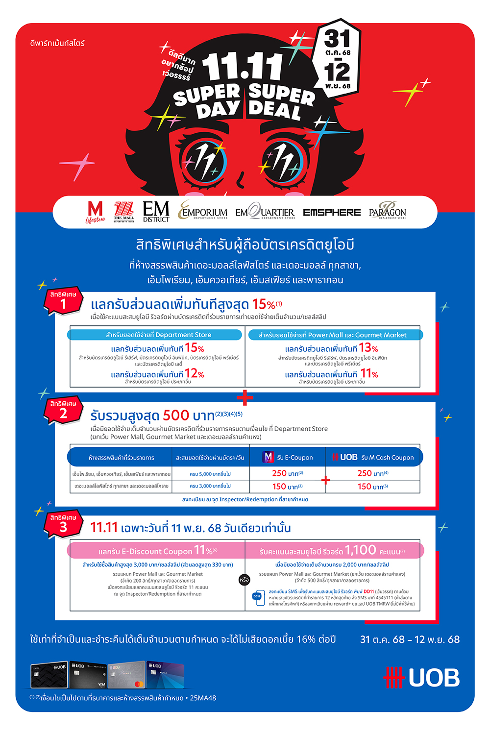 1.    ผู้ถือบัตรเครดิตยูโอบีลงทะเบียนแลกคะแนนสะสมยูโอบี รีวอร์ด 11 คะแนน ณ จุดลงทะเบียนที่ห้างฯ กำหนด เฉพาะวันที่ 11 พ.ย. 68 รับ E-Discount Coupon 11% ผ่าน M Card Application สำหรับใช้ซื้อสินค้าสูงสุด 3,000 บาท/เซลส์สลิป (ส่วนลดสูงสุด 330 บาท) ยกเว้น บัตรเครดิตเพื่อธุรกิจ, บัตรเครดิตยูโอบี วัน, บัตรเครดิตยูโอบี ซิมเพิล, บัตรเครดิยูโอบี โยโล่ แพลทินัม, บัตรเครดิตยูโอบี ลาซาด้า, บัตรเครดิตยูโอบี แม็คโคร, บัตรเครดิตยูโอบี แกร็บ, บัตรเครดิตยูโอบี รอยัล ออร์คิด พลัส ทุกประเภท, บัตรเครดิตยูโอบี คริสฟลายเออร์ เวิลด์ ทุกประเภท, บัตรเครดิต TMRW และบัตรเสริม