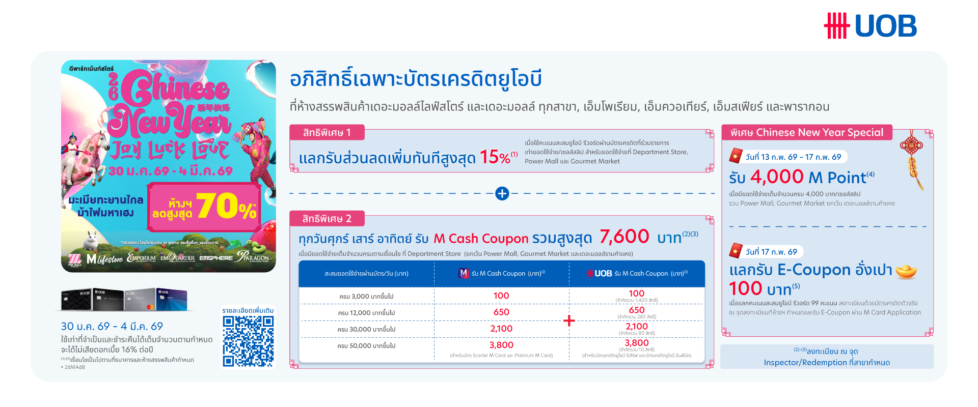 เงื่อนไขการรับ 4,000 M Point(4): รายการส่งเสริมการขายนี้ ระหว่างวันที่ 13 ก.พ. 69 – 17 ก.พ. 69 (5 วัน) เฉพาะผู้ถือบัตรเครดิตยูโอบีที่ออกในประเทศไทยเท่านั้น (ยกเว้นบัตรเครดิตเพื่อธุรกิจ)