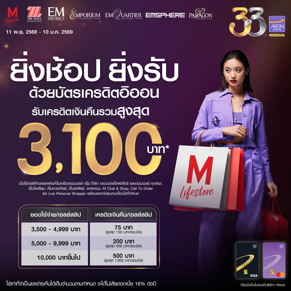 ยกเว้น บัตรเครดิต ทีซีซี พริวิเลจ การ์ด, บัตรเครดิตในเครือกรุงศรี คอนซูมเมอร์ ได้แก่ บัตรเครดิต เซ็นทรัล เดอะวัน, บัตรเครดิต โลตัส และบัตรเครดิต กรุงศรี เฟิร์สช้อยส์ ทุกประเภท บัตรเครดิต สยาม ทาคาชิมายะ ทุกประเภท บัตรเครดิต เอไอเอ วีซ่า บัตรเครดิต เอไอเอ วีซ่า แพลทินัม บัตรเครดิต โฮมโปร วีซ่า บัตรเครดิต โฮมโปร วีซ่า แพลทินัม บัตรเครดิต กรุงศรี แมนเชสเตอร์, จำกัดรับ M Cash Coupon สูงสุด 3,800 บาท/ท่าน/ทุกสาขา/ตลอดรายการ, จำกัดรวม 1,477 สิทธิ์/ทุกสาขา/ตลอดรายการ, นำใบเสร็จ เซลล์สลิป และบัตรเครดิตมาลงทะเบียนรับ M Cash Coupon ภายในวันและสาขาที่ทำรายการ ณ จุดแลกรับของสมนาคุณที่ห้างฯกำหนด, สาขาเอ็มโพเรียม เอ็มควอเทียร์ และเอ็มสเฟียร์ สามารถรวมใบเสร็จกันได้, ใบเสร็จหรือเซลส์สลิปบัตรเครดิตที่ใช้ลงทะเบียนรับสิทธิ์ไปแล้วไม่สามารถนำไปใช้รับสิทธิ์ร่วมกับรายการส่งเสริมการขายอื่นของบัตรเครดิต กรุงศรี ได้อีก, M Cash Coupon หมดอายุการใช้งานในวันที่ 31 มี.ค. 69, สงวนสิทธิ์การใช้ M Cash Coupon สำหรับซื้อสินค้าในครั้งถัดไปคู่กับบัตรเครดิตธนาคาร กรุงศรี เท่านั้น