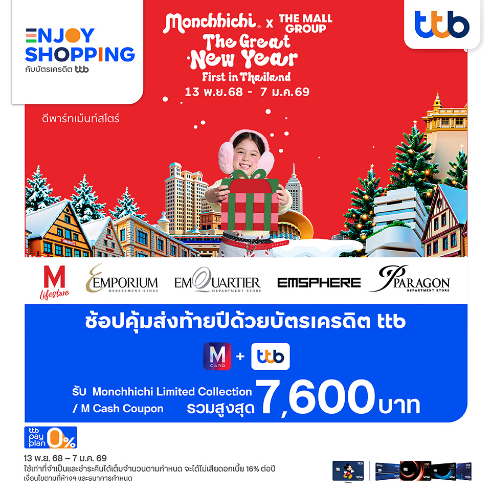 จำกัดรับ M Cash Coupon สูงสุด 3,800 บาท/บัตร/ทุกสาขา/ตลอดรายการ, จำกัดรวม 1,550 สิทธิ์/ทุกสาขา/ตลอดรายการ, นำใบเสร็จ เซลล์สลิป และบัตรเครดิตมาลงทะเบียนรับ M Cash Coupon ภายในวันและสาขาที่ทำรายการ ณ จุดแลกรับของสมนาคุณที่ห้างฯกำหนด, ใบเสร็จหรือเซลส์สลิปบัตรเครดิตที่ใช้ลงทะเบียนรับสิทธิ์ไปแล้วไม่สามารถนำไปใช้รับสิทธิ์ร่วมกับรายการส่งเสริมการขายอื่นของบัตรเครดิต ttb ได้อีก, M Cash Coupon หมดอายุการใช้งานในวันที่ 31 มี.ค. 69