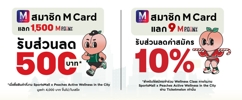 • สมาชิก M Card แลก 9 M Point รับส่วนลดค่าสมัครเข้าร่วมคลาส 10% สำหรับใช้สมัครเข้าร่วม Wellness Class ผ่านระบบ Ticketmelon