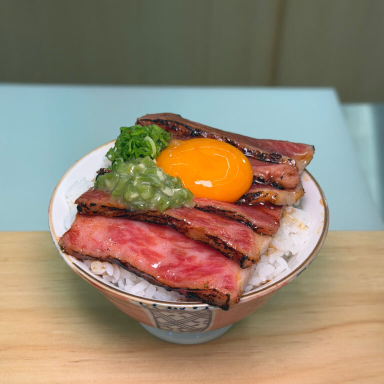 Wagyu A5 steak don เมนูข้าวหน้าสเต็กเนื้อวากิวเกรด A5 ราดด้วยซอสรสชาติเข้มข้น เบิร์นไฟ ออนท็อปด้วยไข่ดอง